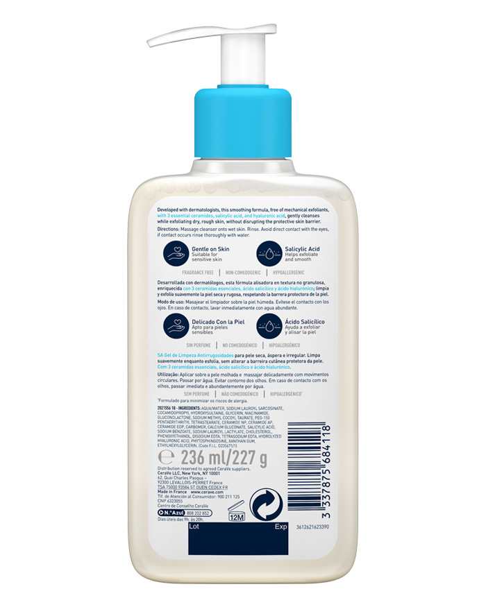A gentle salicylic acid cleanser can help exfoliate and smooth your skin while also effectively removing oil and dirt, sweeping away dead cells, and softening rough skin—without leaving skin feeling dry.Cleansing with CeraVe SA Smoothing Cleanser, a salicylic acid cleanser enhanced with barrier-restoring ingredients like ceramides, can help keep moisture in while keeping irritants out.